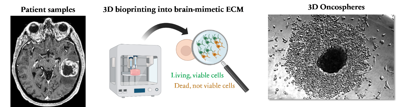 In our lab, we have recently established an enabling 3D model of GBM designed to recapitulate peculiar aspects of the brain tumor microenvironment that are known to modulate cancer resistance in vivo and include tissue-specific components of the extracellular matrix as well as human brain cells. This project will consist in conducting a proof-of-concept study to assess drug resistance of patient-derived tumors against existing and novel therapies. We will test the hypothesis that our new in vitro system supports patient-derived GSCs’ survival and maintenance of self-renewal markers when cancer cells are exposed to therapeutics used in the clinic. The project will include training in the use of advanced bioprinting methods, cell culture, and microscopy imaging.