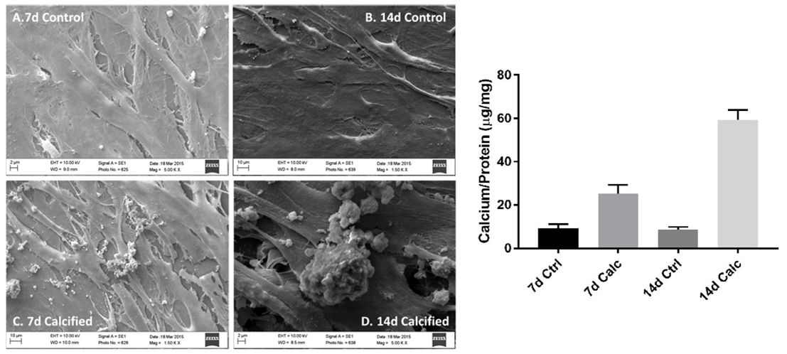 Figure 1. The addition of inorganic phosphate significantly induced phenotypic modulation and calcification as compared to controls in calcified cells over 7 and 14 days (p<0.05). SEM images demonstrate the increase in mineral nodule formation in (Fig 1C & 1D) calcified cells over controls (Fig 1A & 1B). EDS analysis confirmed the presence of calcium and phosphorus ions in the mineral nodules. Figure 1C: 10.95% Calcium by weight. Figure 1D: 22.63% calcium and 16.02% phosphorus by weight.
