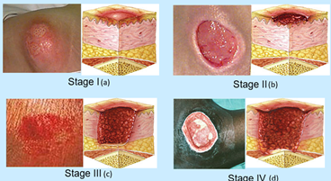 Pressure ulcers (PrUs), also known as bed sores, occur when the skin is exposed to pressure for a long period of time. This constant pressure results in decreased perfusion (blood flow) through a localized area of skin. Decrease in perfusion results in injury to the tissue with varying depth and severity. Current guidelines set by the National Pressure Ulcer Advisory Panel (NPUAP) are based solely on observation of the tissue, the wound bed of the PrU, and feeling the affected area for temperature or elasticity changes. Categorization is according to the guidelines (Braden Scale), as shown in Figure 1. This approach is an immense source of error in PrU diagnosis as it is subjective and vague. For example, the NPUAP guidelines state that a Stage 1 PrU (Fig. 1A) may be “painful, firm, soft, warmer or cooler as compared to adjacent tissue”. PrUs have significant patient morbidity and high costs to healthcare facilities. Early detection of erythema can prevent the progression of ulcers at stage I or II to more serious Stage III or Stage IV pressure ulcers.