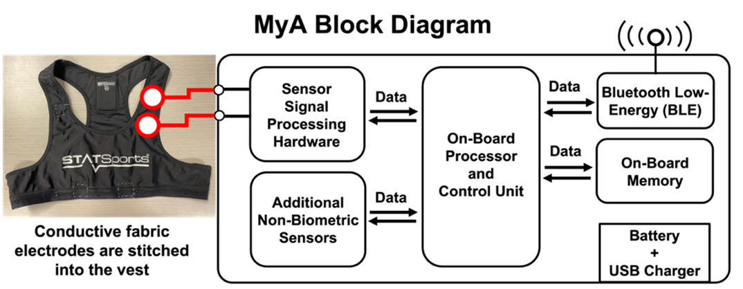 Figure 1. MyA system block diagram depicting essential internal functions as well as connections to the textile.