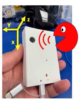 Figure 1. An early prototype of Peapod, a device with integrated motion and audio sensors for measuring forces experienced by a newborn during transport.