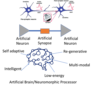 - Neuromorphic Devices and Computing: Albert Einstein famously said, “Look deep into nature, and then you will understand everything better”. A biological brain is an excellent computing machine. While today’s digital computers are extremely good at general purpose computing, they fail when it comes to solving a subjective computing problems. For example, a human brain can easily make decisions based on surrounding environmental conditions. A similar decision-making would be a daunting task for digital computers. Additionally, as CMOS devices are approaching their fundamental scaling limits, it becomes important to explore alternative ways of computing that are power efficient and scalable. To this end, people have traditionally explored Neural Networks. In fact, Deep Neural Networks (DNN) based machine learning is becoming increasingly important Developing brain inspired components such as neurons and synapses for cognitive computing. Image source: LinkedIn. Application of novel low-power data storage devices. Image source: Google IoT PoC Wearable electronics Smart phones Tablets Laptop Data storage Hardware Security ReRAM Devices Microelectronics and Integrated-Systems with Neuro-centric Devices (MIND) these days where cloud is getting inundated with massive amount of data generated by various sources. However, DNN still runs on digital computers that uses fundamentally different components and architecture than those found in a biological brain. Therefore, to address this challenge, our research group focuses on understanding the components and circuits in a biological brain and develops nanoelectronic neuromorphic devices and circuits that can match the energy-efficiency, scalability, and robustness of a biological brain for biomimetic learningbased computing and decision making. This research aligns closely with the recent grand challenge announcement from the White House in the areas of brain inspired computing.