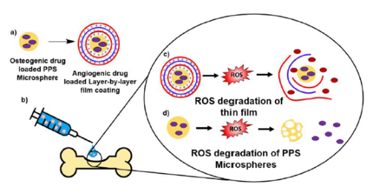Figure 1. Overview of the dual therapy system. a) Synthesis of drug loaded PPS microparticles coated with drug loaded LbL thin films. b) Injection of the system into a critically-sized bone defect. c) Initial ROS-degradation of thin film and pro-angiogenic drug release, followed by d) ROS-degradation of PPS microspheres and pro-osteogenic drug release.